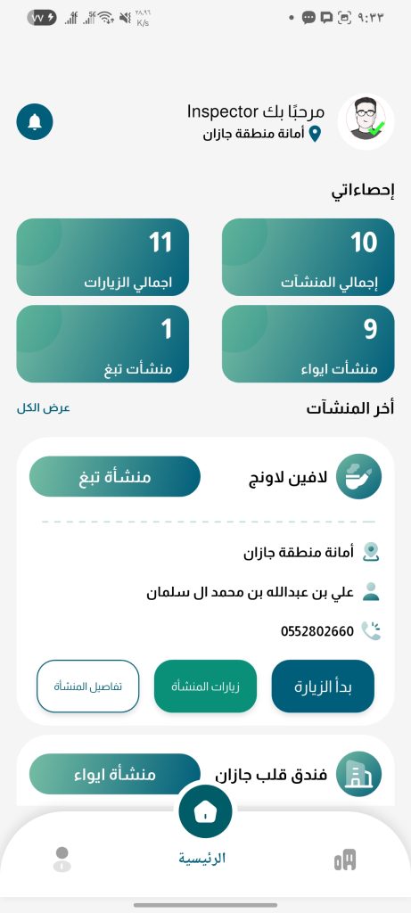الواجهة الرئيسية للمفتش توضح اجمالي عدد المنشآت موزع بها كافة التفاصيل التي يحتاجها المفتش لانجاز العمل المطلوب منه .